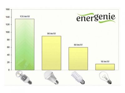 W przeciwieństwie do większości tradycyjnych żarówek gdzie LEDy są rozmieszczone na płaskiej powierzchni 2D- powoduje to poszerzenie kąta świecenia do 330 ° , podczas gdy większość innych żarówek LED świeci pod kątem zaledwie 140 ° -160 °. EnerGenie LED ma niesamowitą wydajność - 135 lumenów na wat. Jest to około 40% lepiej niż w tradycyjnych żarówkach LED!